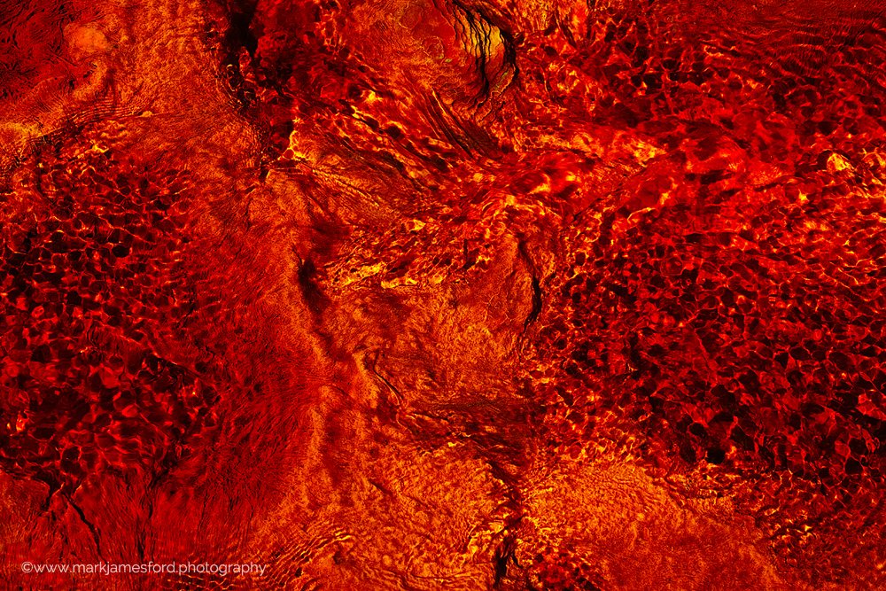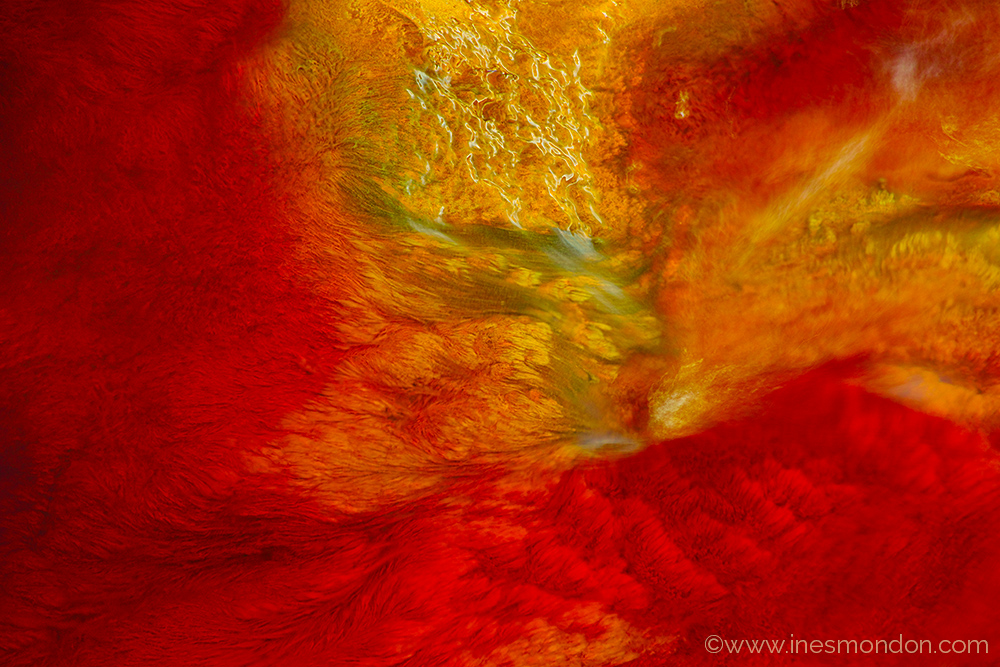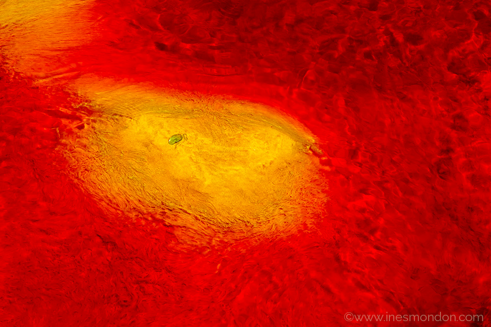 Mark was keen to explore the actual colour and detail within the water itself experimenting with visualising either surface structures or structures and details below the surface or a mixture of both. Ines of on the other hand, extends this concept even further, often exploring the relationship between the structures within the water and its surroundings. The conditions were at the limit for a digital camera (in a black camera housing) and on several occasions one or other of our cameras gave an ‘overheating’ warning and had to be placed in the shade of a none too cool camera bag. Unusually, for our photography, because the colours in the water are at their most intense when the sun is directly shining on it, we wanted to photograph on or around the middle of the day so that in general about two hours in the sun with no available shade was the limit for us anyway – despite ample water and heavy sunscreen!