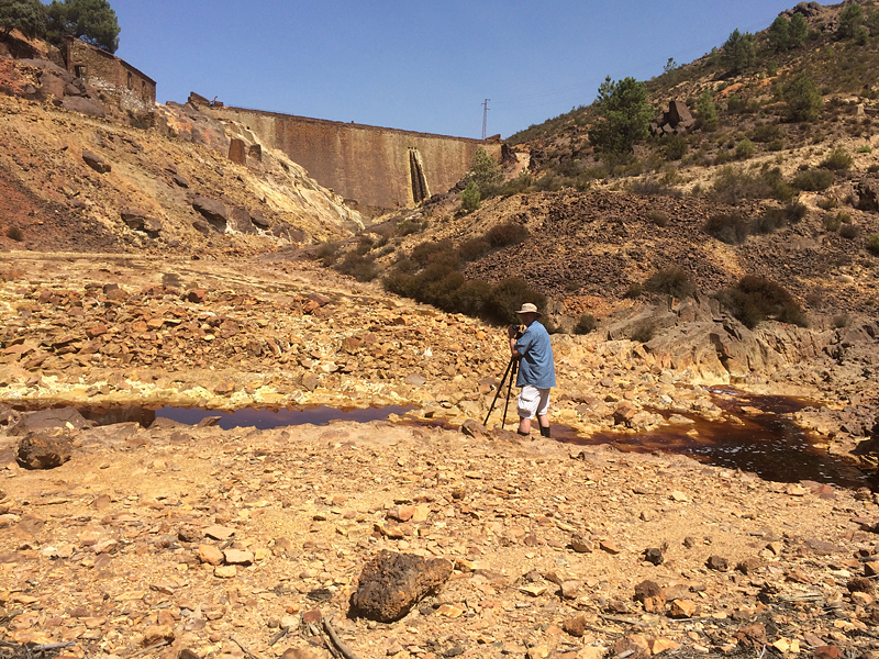 The landscape is in general quite surreal in places and the baking summer heat makes the idea that this was once a thriving industrial area no less surreal. Further down stream the water appears at first glance to be more normal, and, at nearly 40°C air temperature invitingly refreshing, nevertheless the dead insects, the colour of the water, as well as the sulphurous crystalline growths along its edge portray the fact that this river is anything other than ordinary. And this is why we were here: Fascinating for me as a chemist, the resulting reds, yellows, oranges and greens which glow intensely in the Spanish sun are a dream for a photographer …